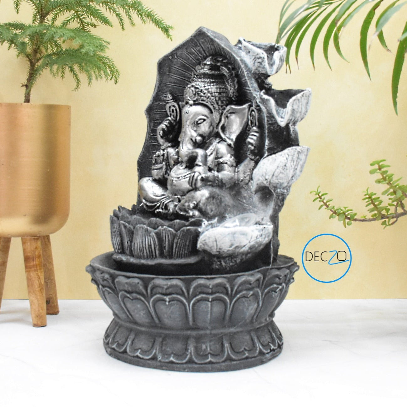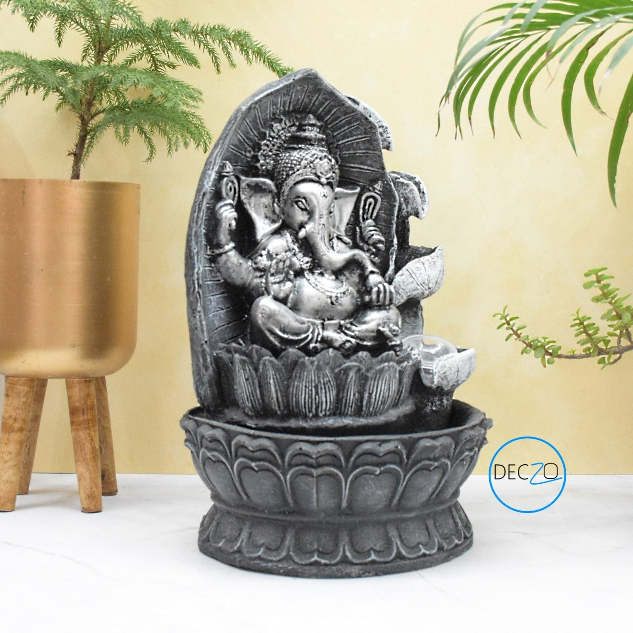 Ganesha Sitting on Lotus Water Fountain : 37 CM, Black-Silver