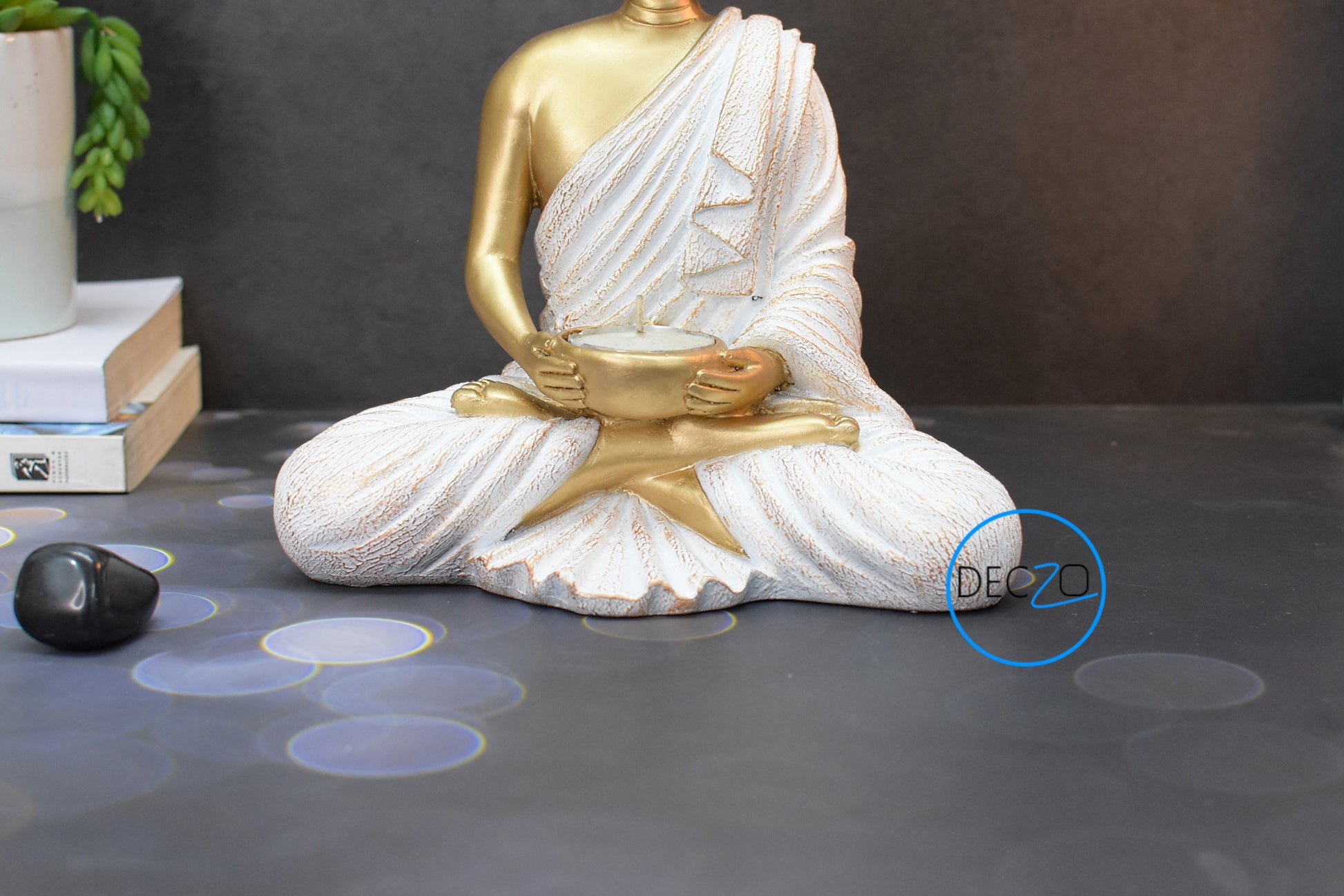 Meditating Buddha Tealight Holder : 21CM, Golden & White